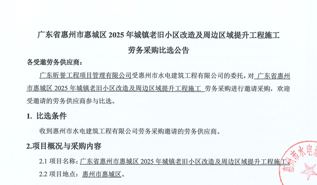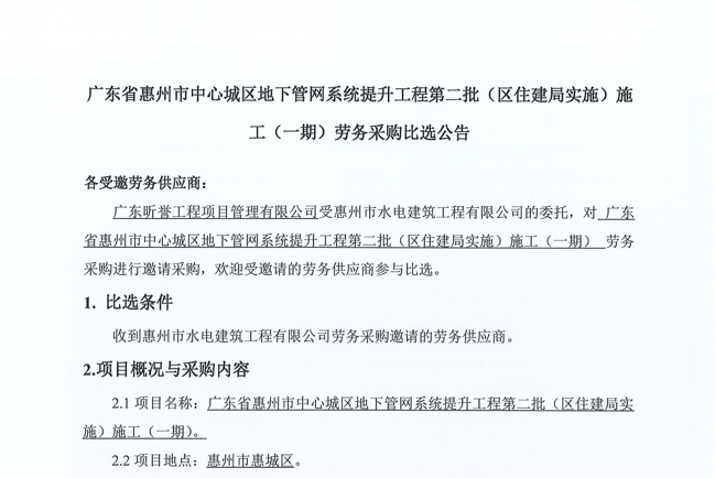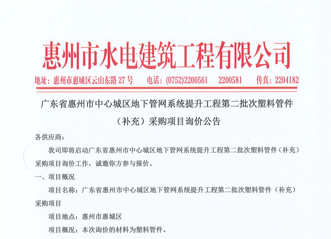 廣東省惠州市中心城區地下管網系統提升工程第二批次塑料管件(補充)采購項目詢價公告……